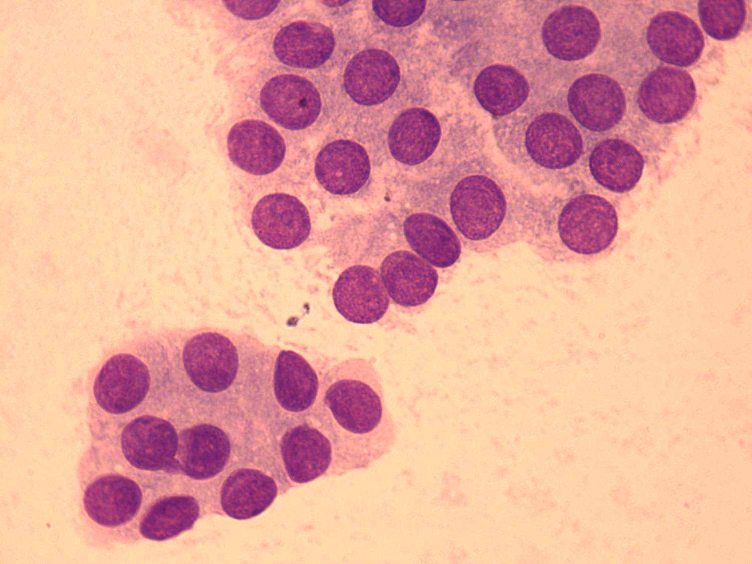 Wright-Giemsa staining, 1000x. This is a monomorphous pattern which is relatively unusual in hyperplastic nodules. It may be debated whether these cells would be oxyphilic cells or would not. The cytoplasm of the cells demonstrated in this case have abundant cytoplasm but lack the finely granular cytoplasmic granulations. The presence of the latter would be a characteristic sign of Hürthle-cells.
