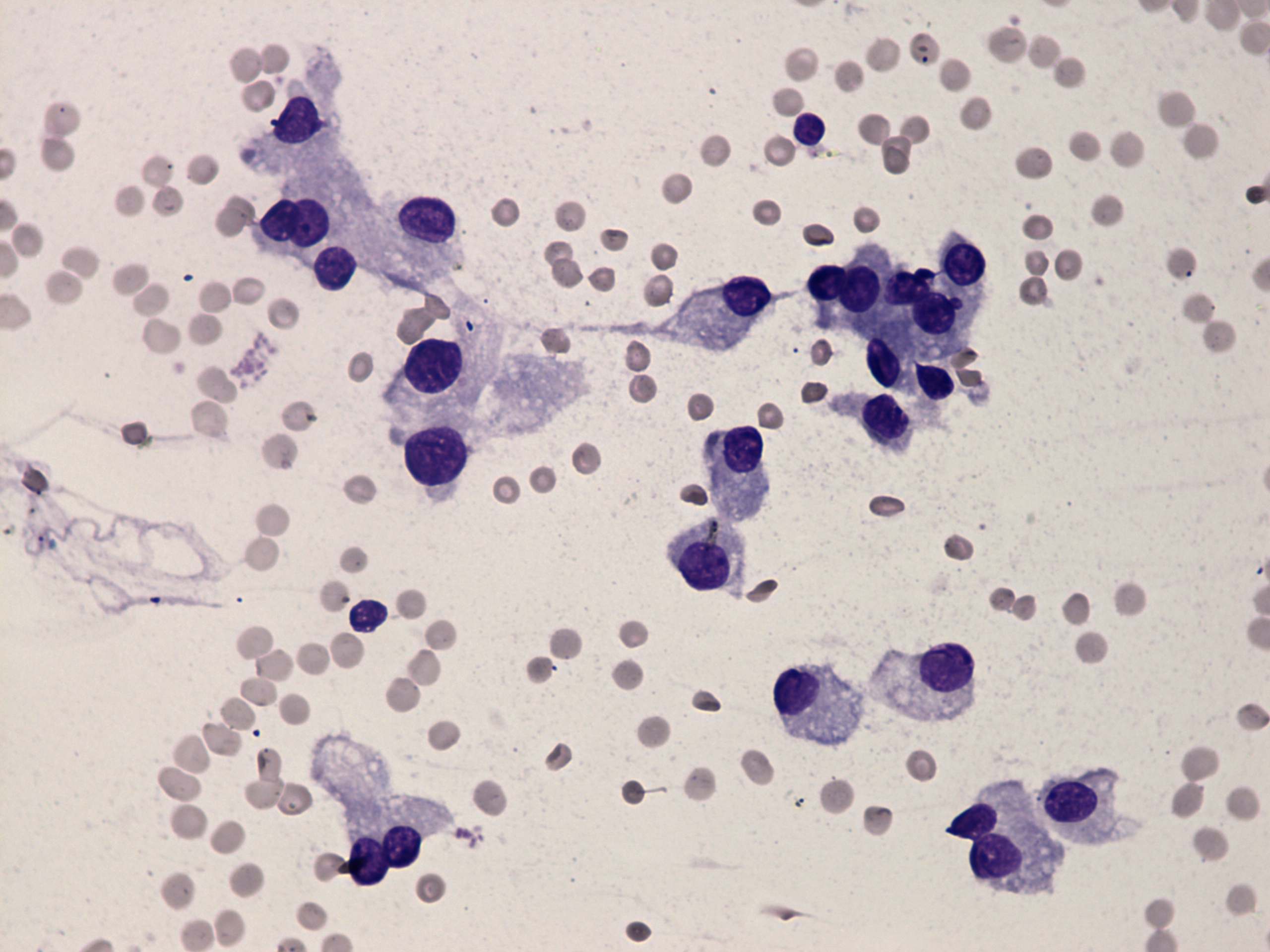 Wright-Giemsa staining, 400x. Dissociated cells presenting oxyphilic metaplasia.