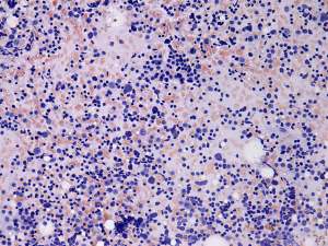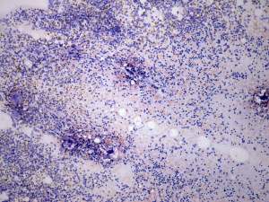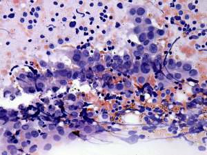 Ultrasonography: the thyroids were moderately hypoechogenic. The dorsal part of the left lobe and the isthmus was more hypoechogenic. This hypoechogenic part seemed to be a nodule on certain ultrasound sections, but thorough analysis excluded the possibility of a nodule in a pathological sense.