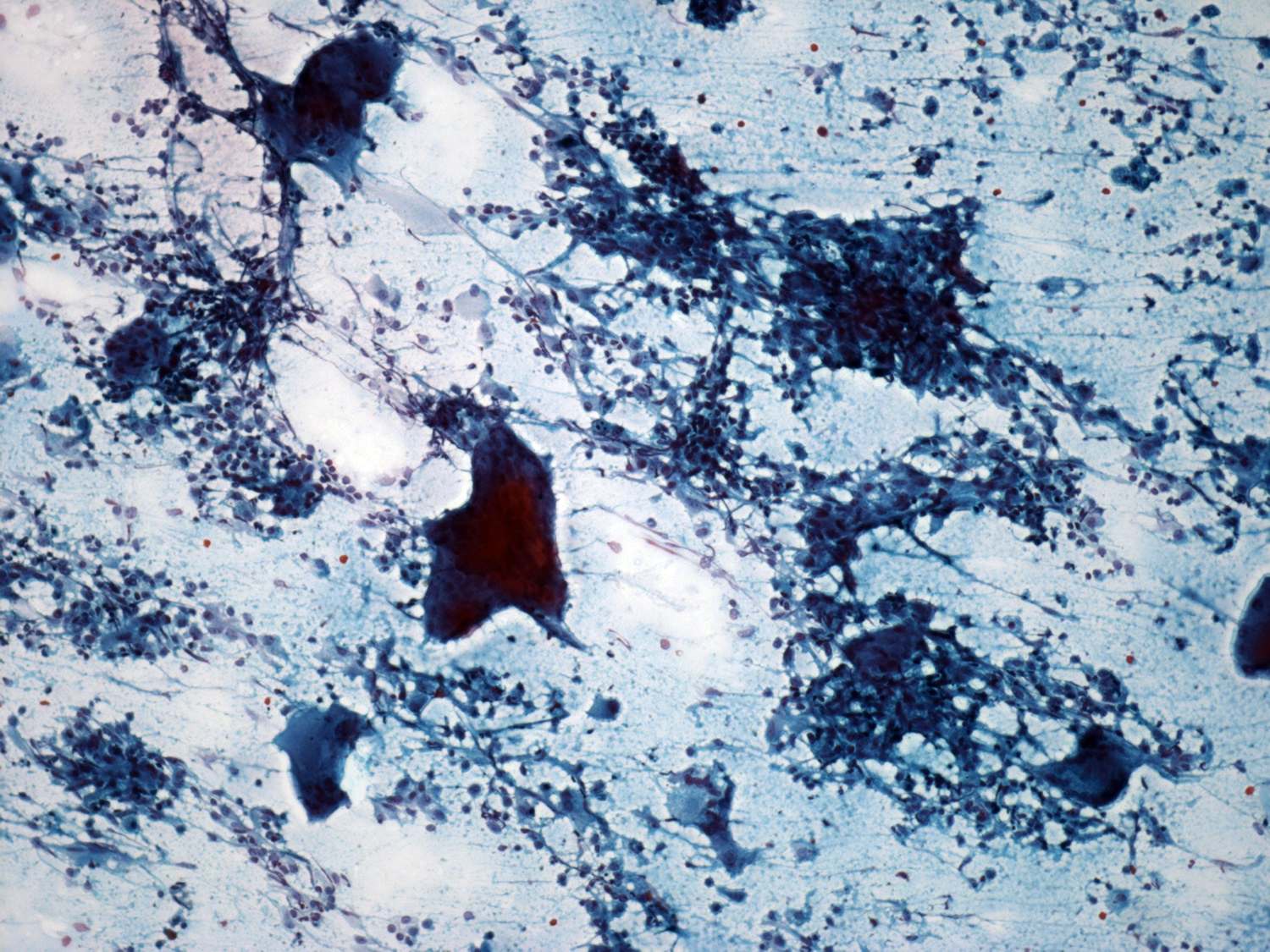 Pap-smear, 100x. There are inflammatory cells in the background and several multinucleated giant cells.