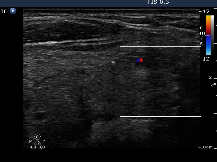 Right lobe and isthmus, longitudinal view, color Doppler method. The vascularization is not specific.