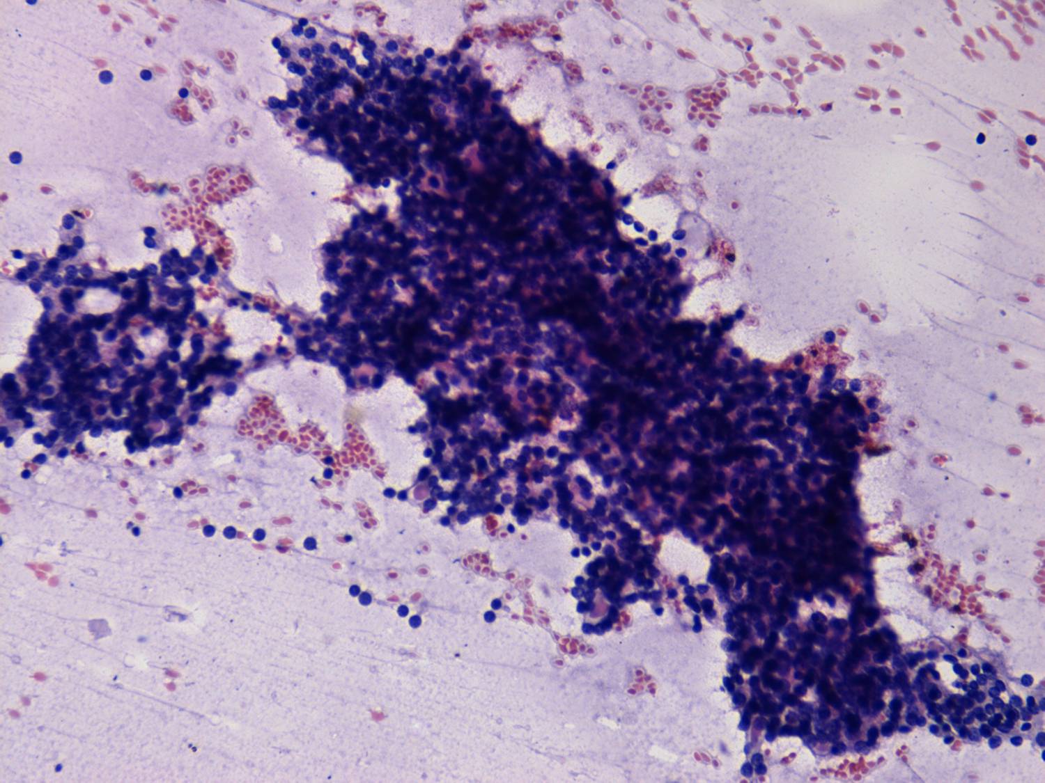 Pap-smear, 200x. Papillary cell groups at higher power field.