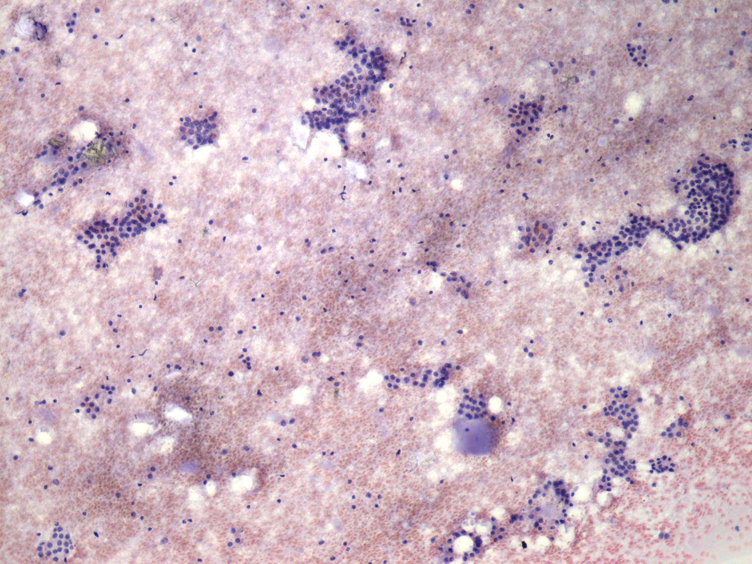 Pap-smear, 100x. There is no colloid in the background. Monolayered sheets predominate the smear.