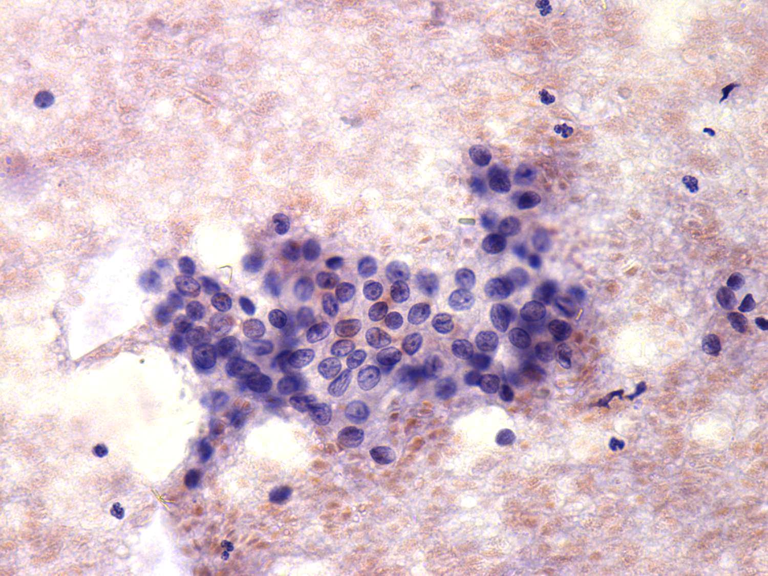 Pap-smear, 400x. A three-dimensional cluster. Follicular cells display prominent nucleoli, scratchy chromatin structure. Great proportion of cells contains groove.