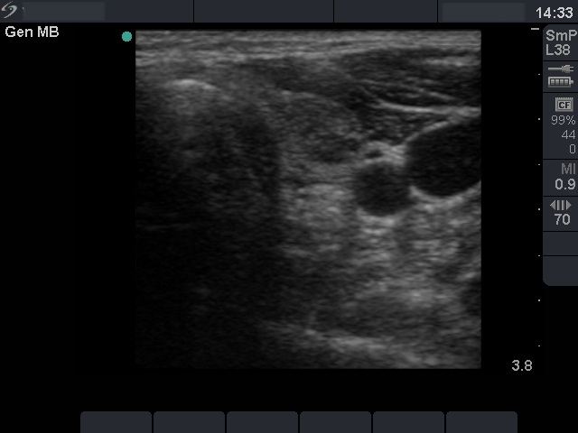 Left lobe, horizontal scan. A hypoechogenic inhomogeneous nodule in the lobe. It contains microcalcifications.
