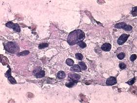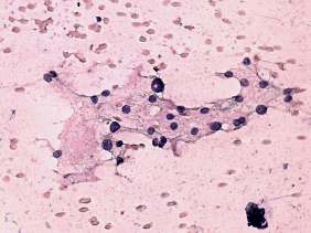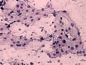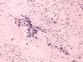 Cytological picture: no colloid in the background. Atypical, pleomorphic follicular cells in loose not specific clusters. Thyrocytes exhibit oxyphilic metaplasia.