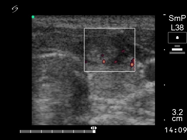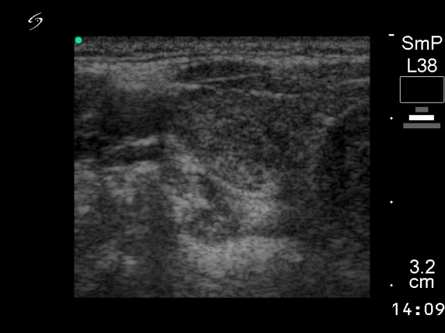 Follow-up investigation: we reevaluated the patient yearly. The whole thyroid slowly became hypoechogenic, while the lesion in question disappeared in 6 years. 5 years after the original diagnosis, the patient became hypothyroid and now she is on daily 75 microgram replacement therapy. Her thyroid was atrophic, the size of the left lobe which contained the lesion, now is not greater than the original size of the lesion within the lobe 7 years earlier.