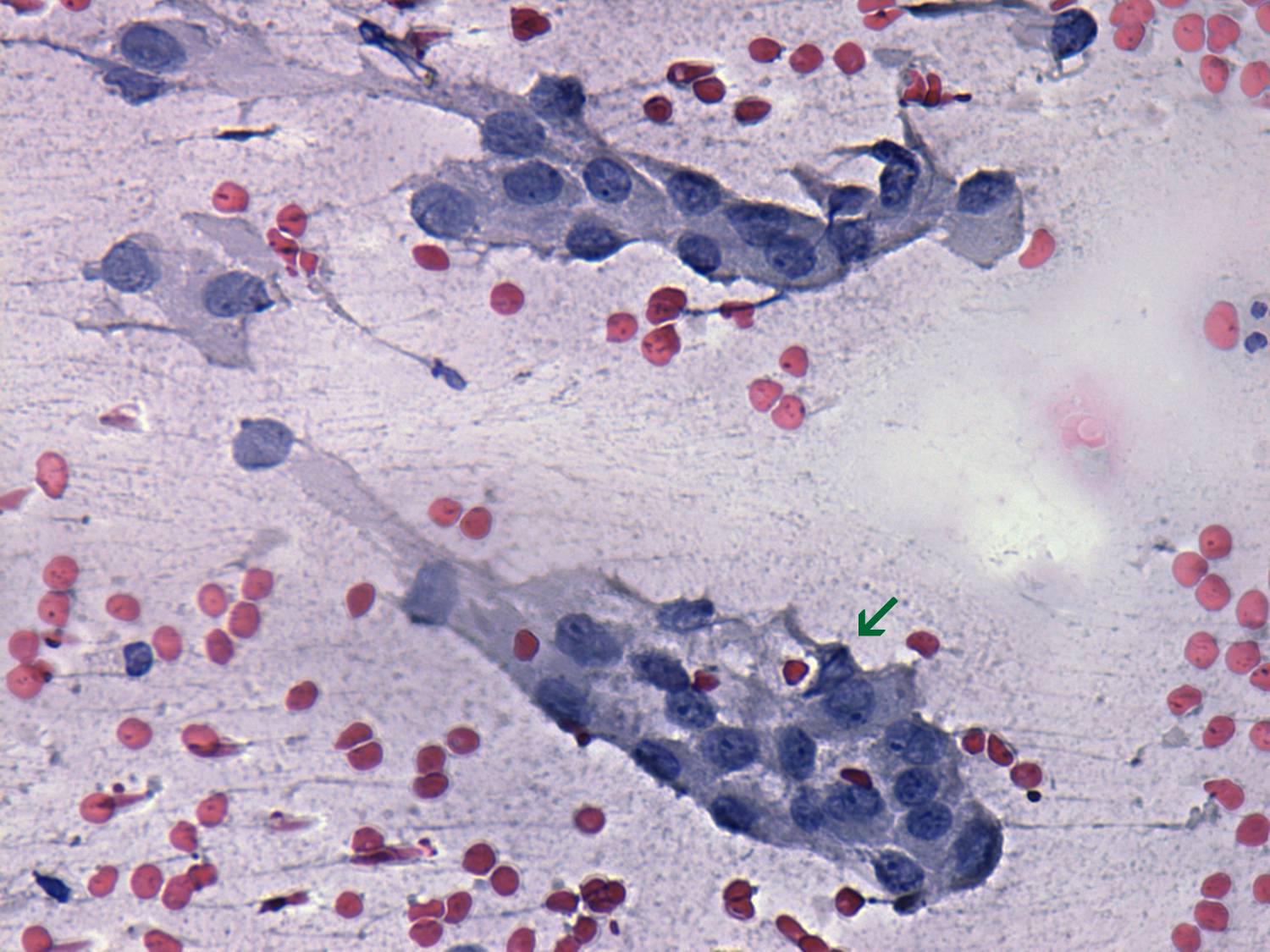 Pap-smear, 400x. Oxyphilic cell groups. Note the presence of a groove marked with green arrow.