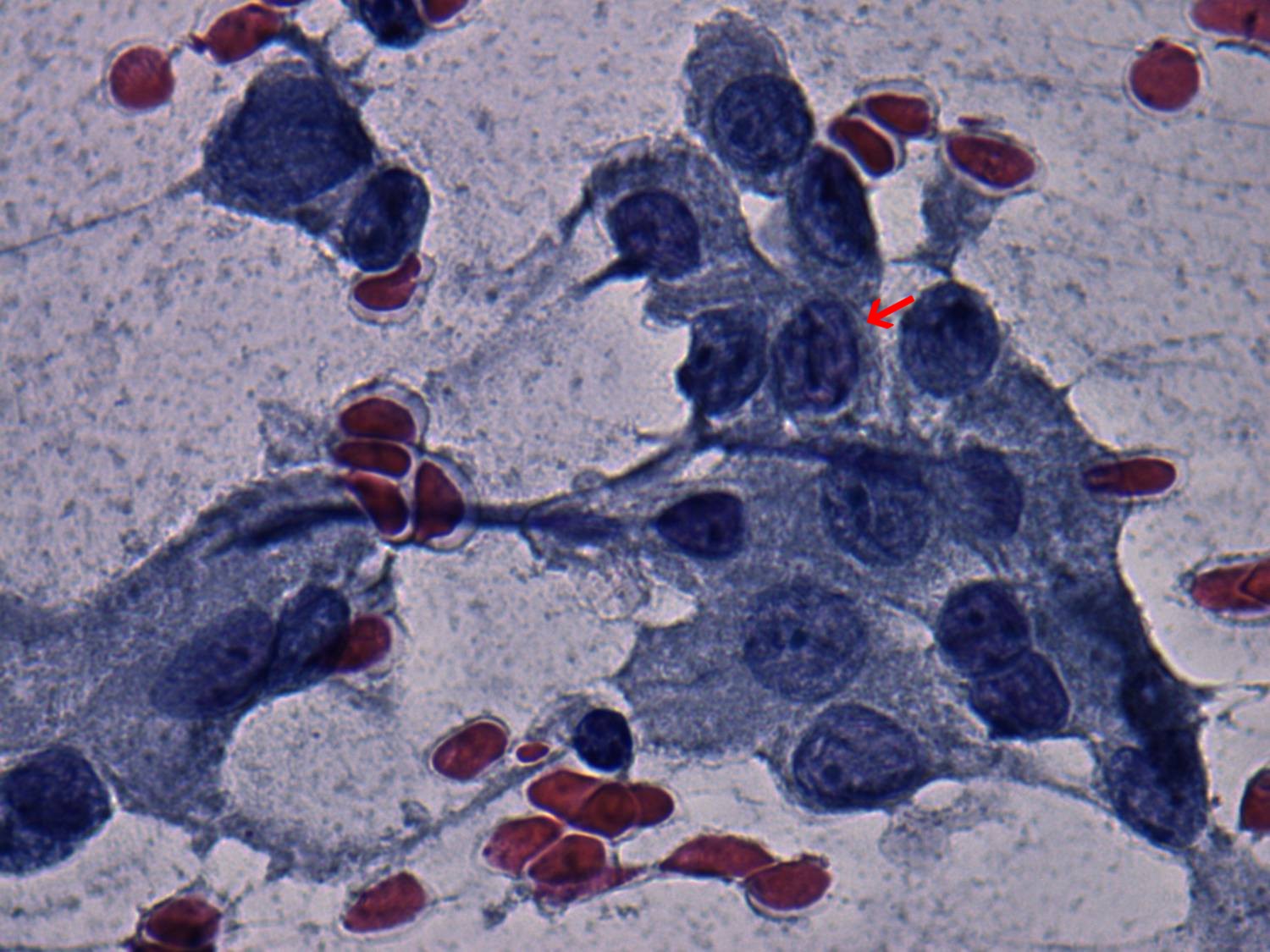 Pap-smear, 1000x. One nucleus with groove (red arrow).