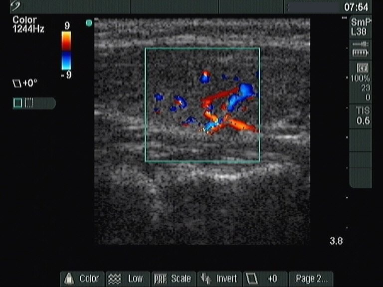 Ultrasonography: the thyroids were moderately hypoechogenic. There was a lesion with similar echo structure in the central part of the left lobe. The nodule displayed a halo sign and both perinodular and intranodular blood flow.