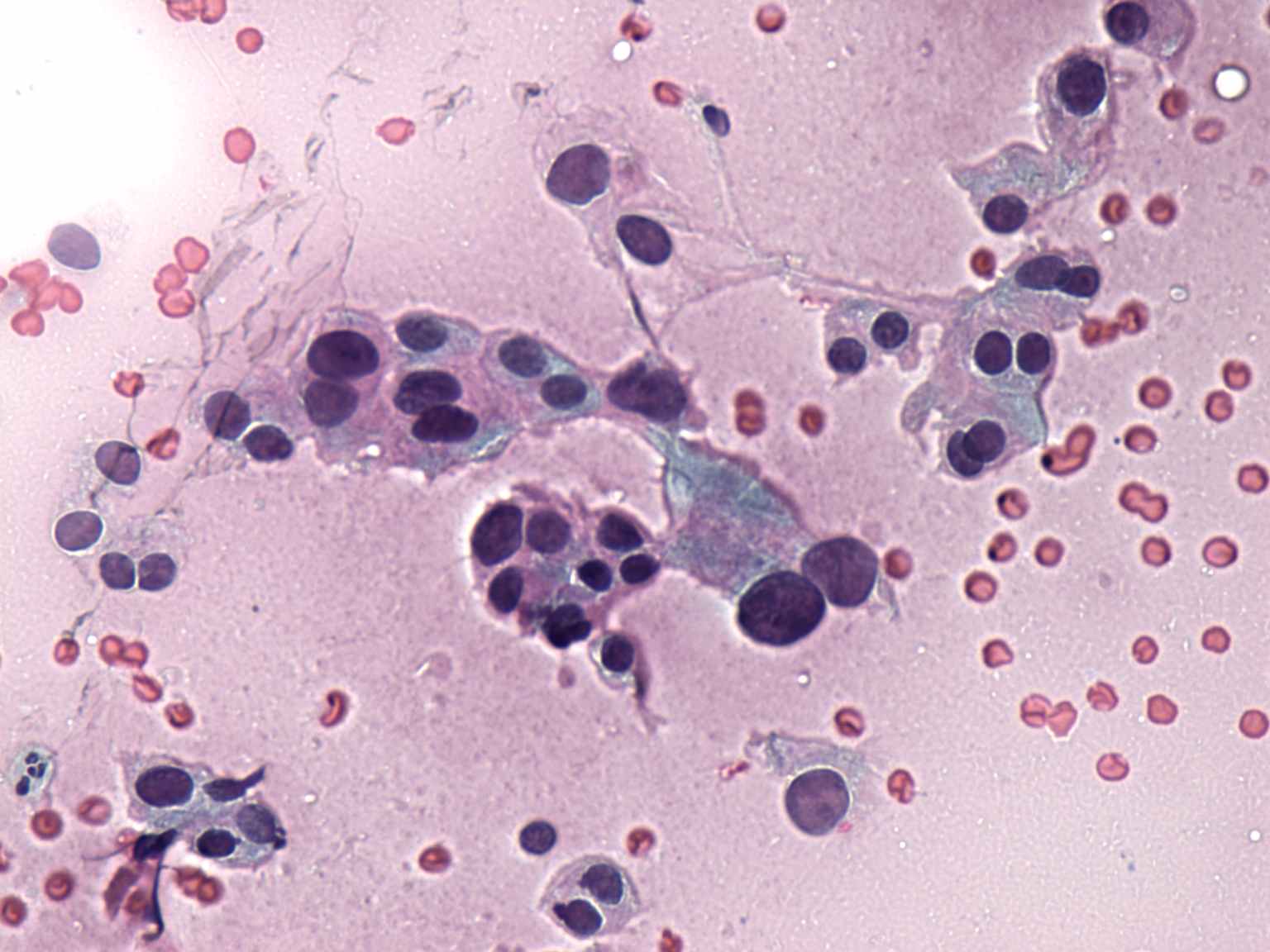 Pap-smear, 400x. Follicular cells in small clusters. Note several enlarged and atypical cells and the lack of prominent nucleoli and intranuclear inclusions or grooves.