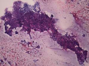 Cytological picture: there is no colloid in the background. Thyrocytes forming microfollicles and small clusters. No significant atypia is present.