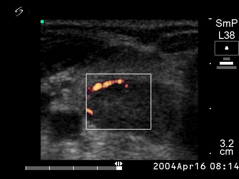 Ultrasonography: an echonormal right lobe with several small hypoechogenic lesions and a hypoechogenic nodule in the dorsal part. The nodule did not exhibit a halo sign but on Doppler mode perinodular blood flow was detected.