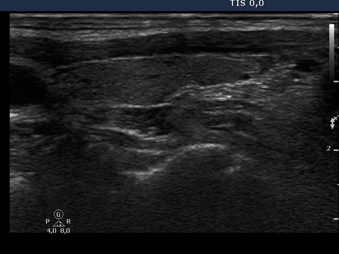 Left lobe, longitudinal scan. There are several small hypoechogenic lesions within an echonormal background.