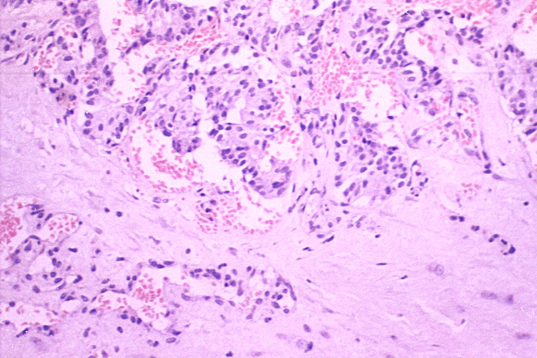 H.E.-section, 200x. Polypoid tumorous growth is present in the lumen of the centrally located blood vessel.