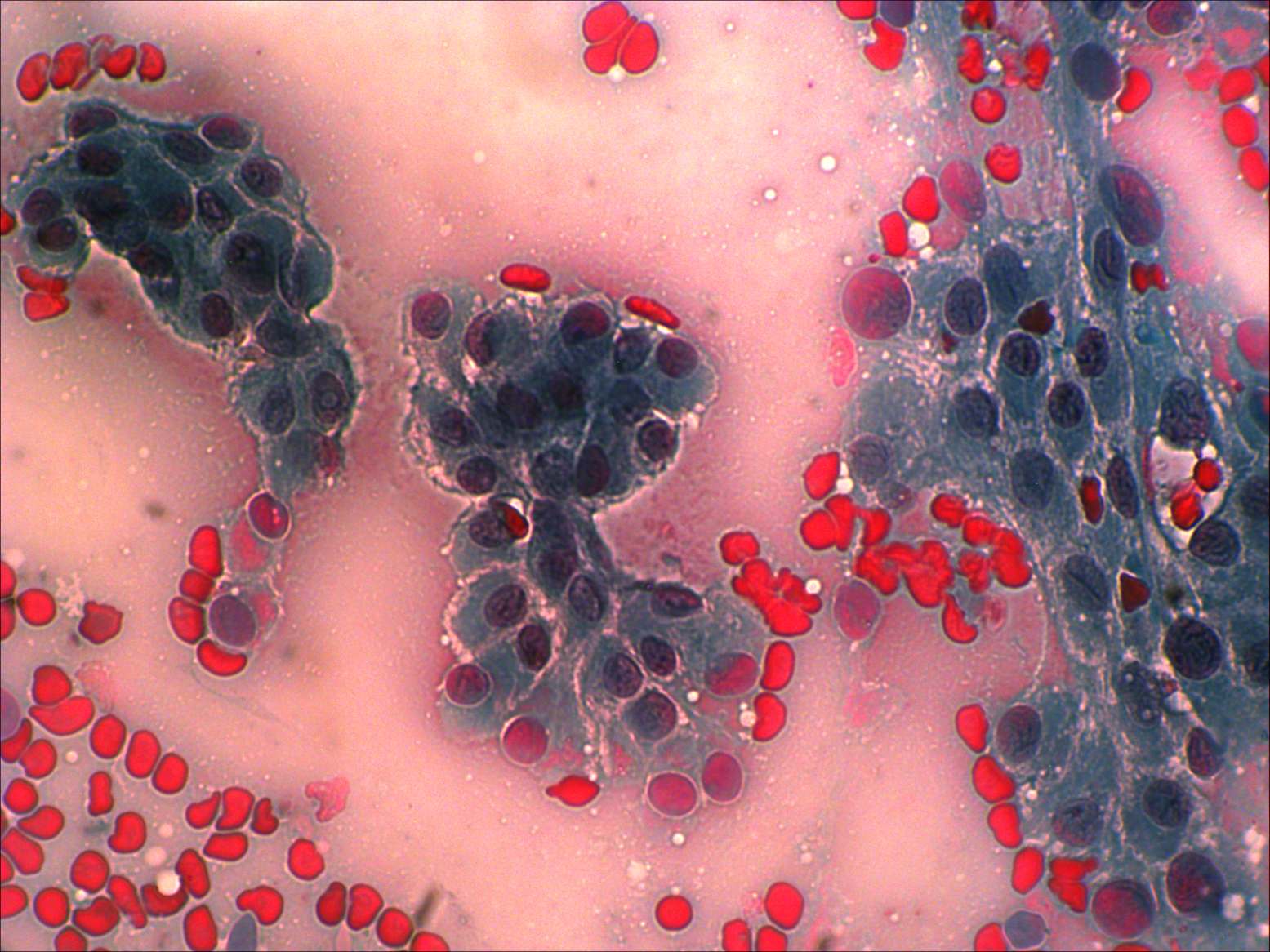 Pap-smear, 400x. Follicular cells show nuclear inclusions and grooves.