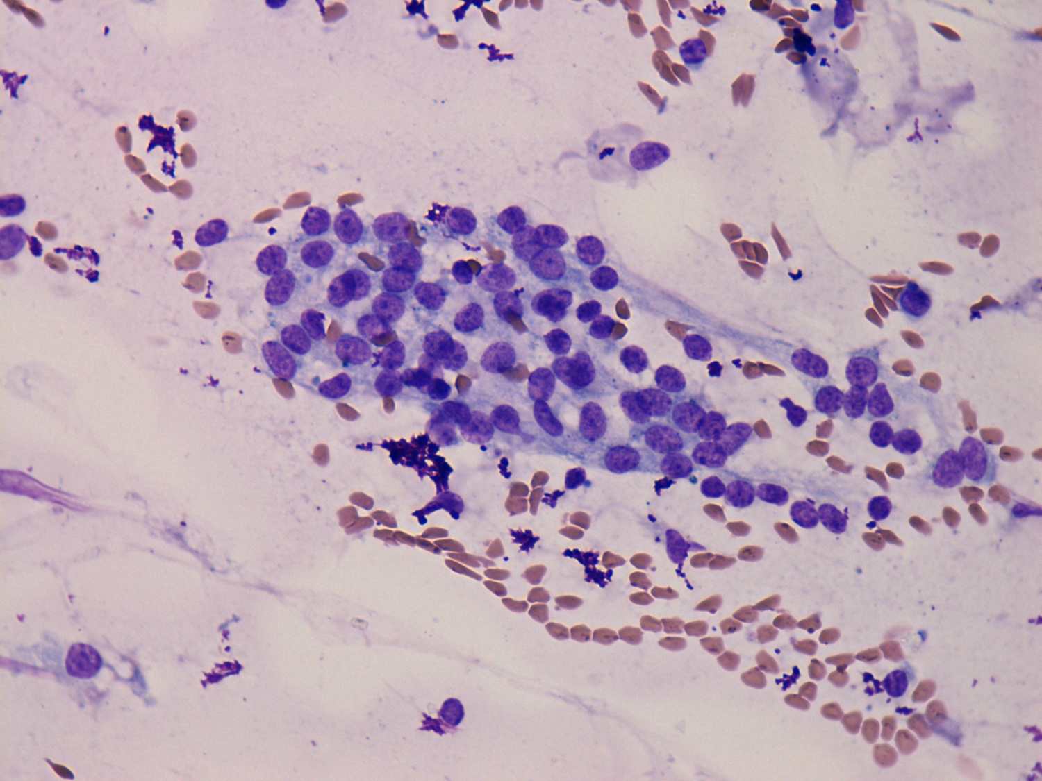 Wright-Giemsa staining, 400x. A cluster of well-preserved follicular cells.
