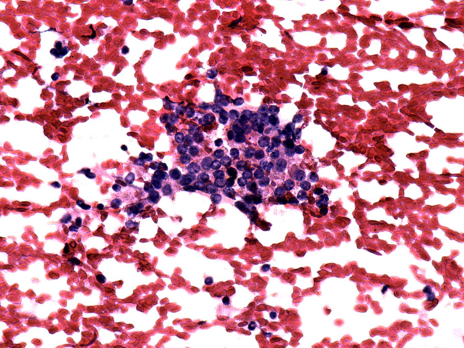Pap-smear, 400x. Follicular cells in an irregular cluster.