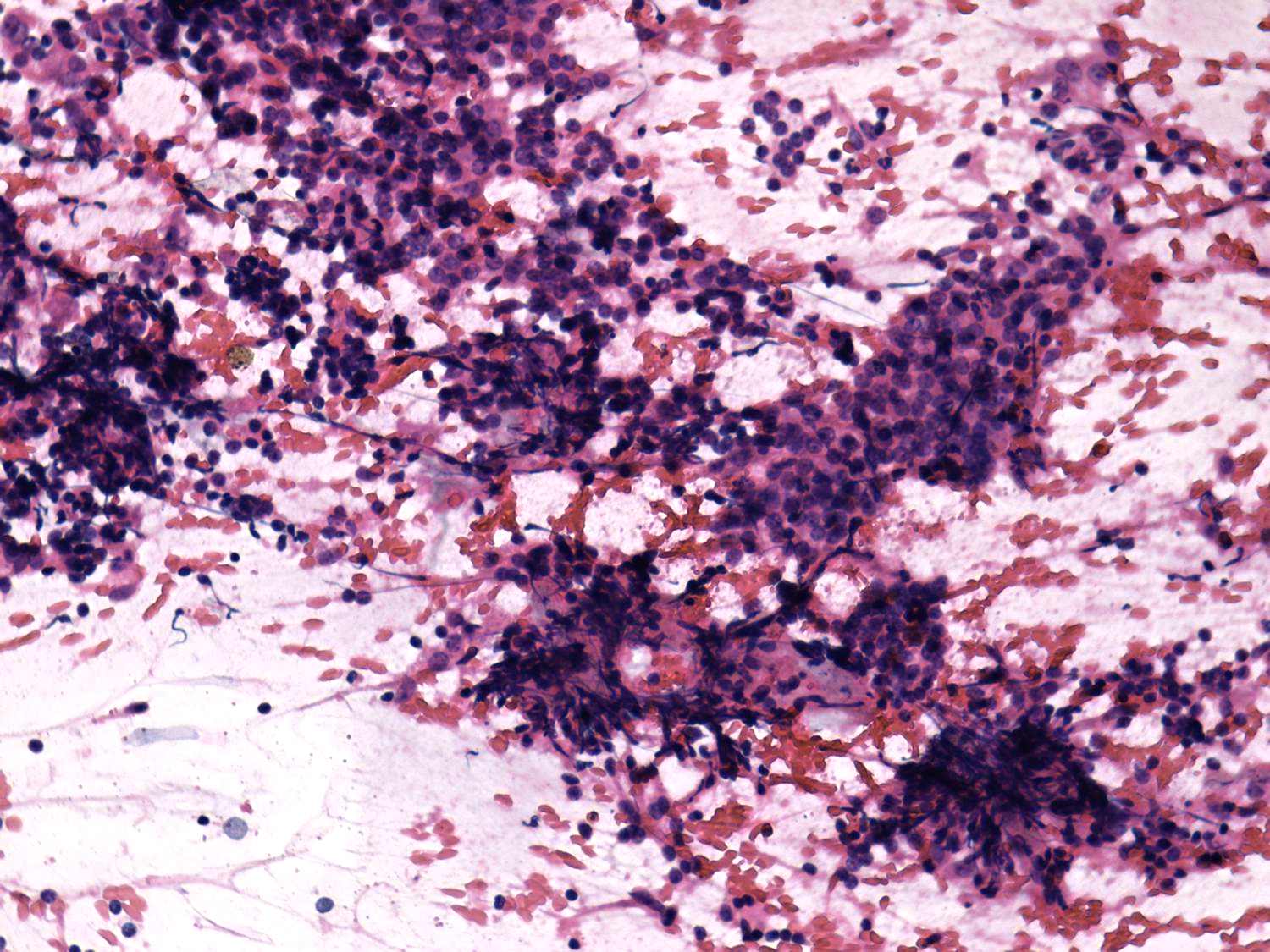 Pap-smear, 400x. Sheets of follicular cells and groups of inflammatory cells