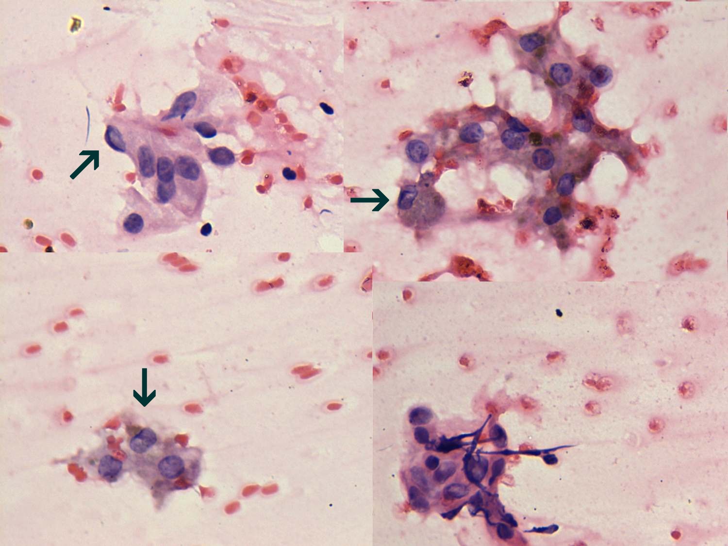 Pap-smear, 400x. The follicular cells have pale nuclei. Dark intranuclear lines resembling groove (green arrows).