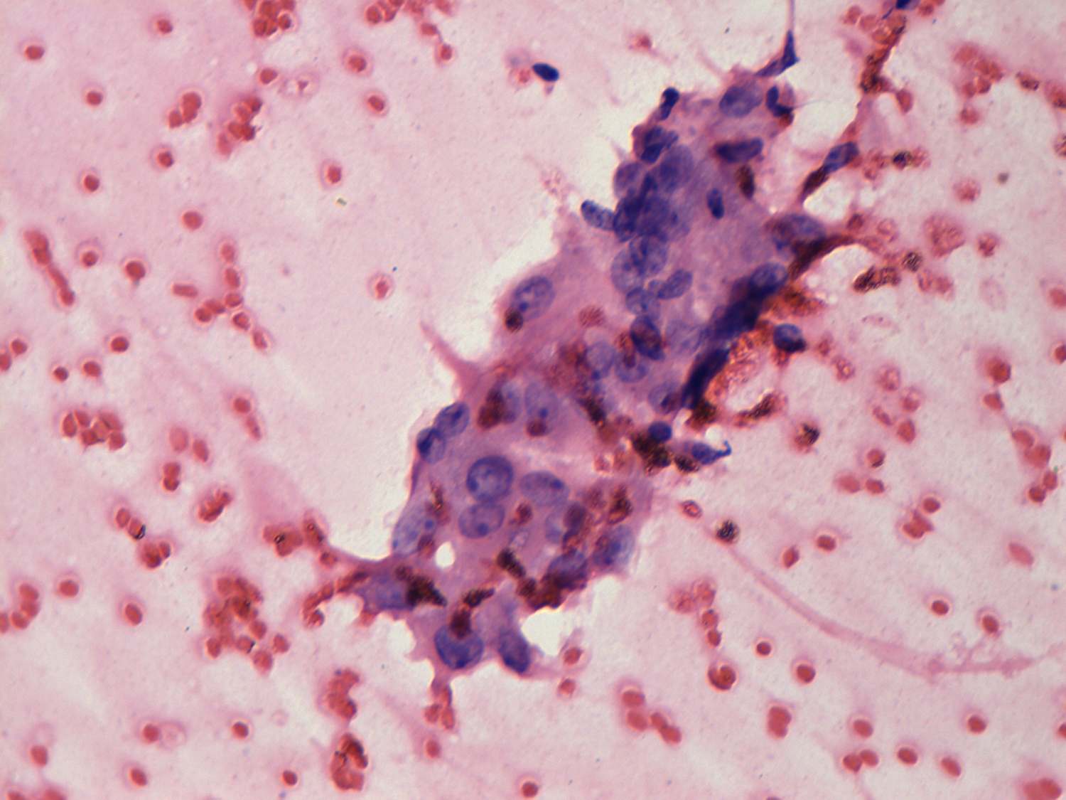 Pap-smear, 400x. Note the nuclear crowding in the upper part of the cell group.