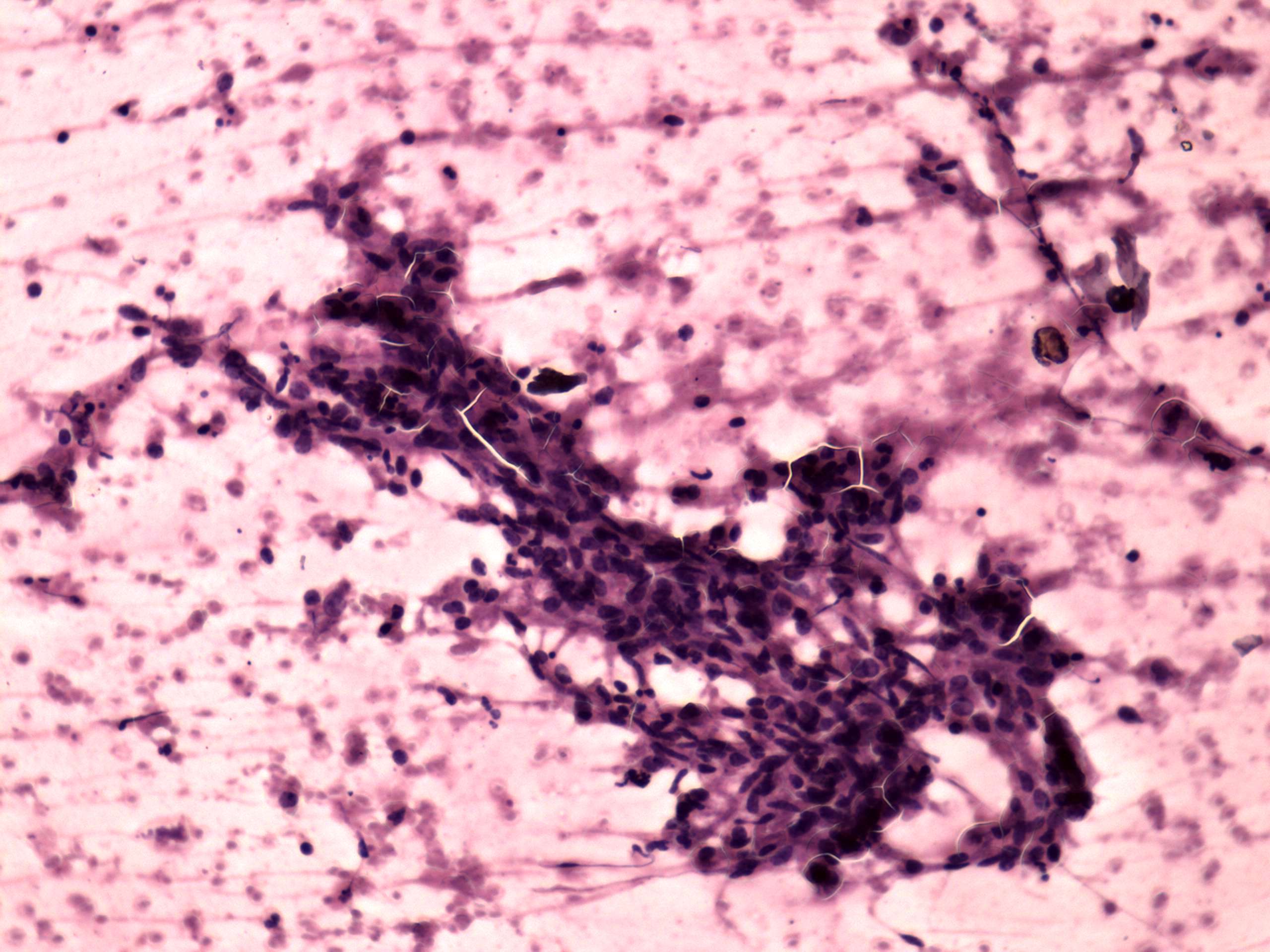 Pap-smear, 200x. A large multinucleated cell composed of elongated epitheloid cells