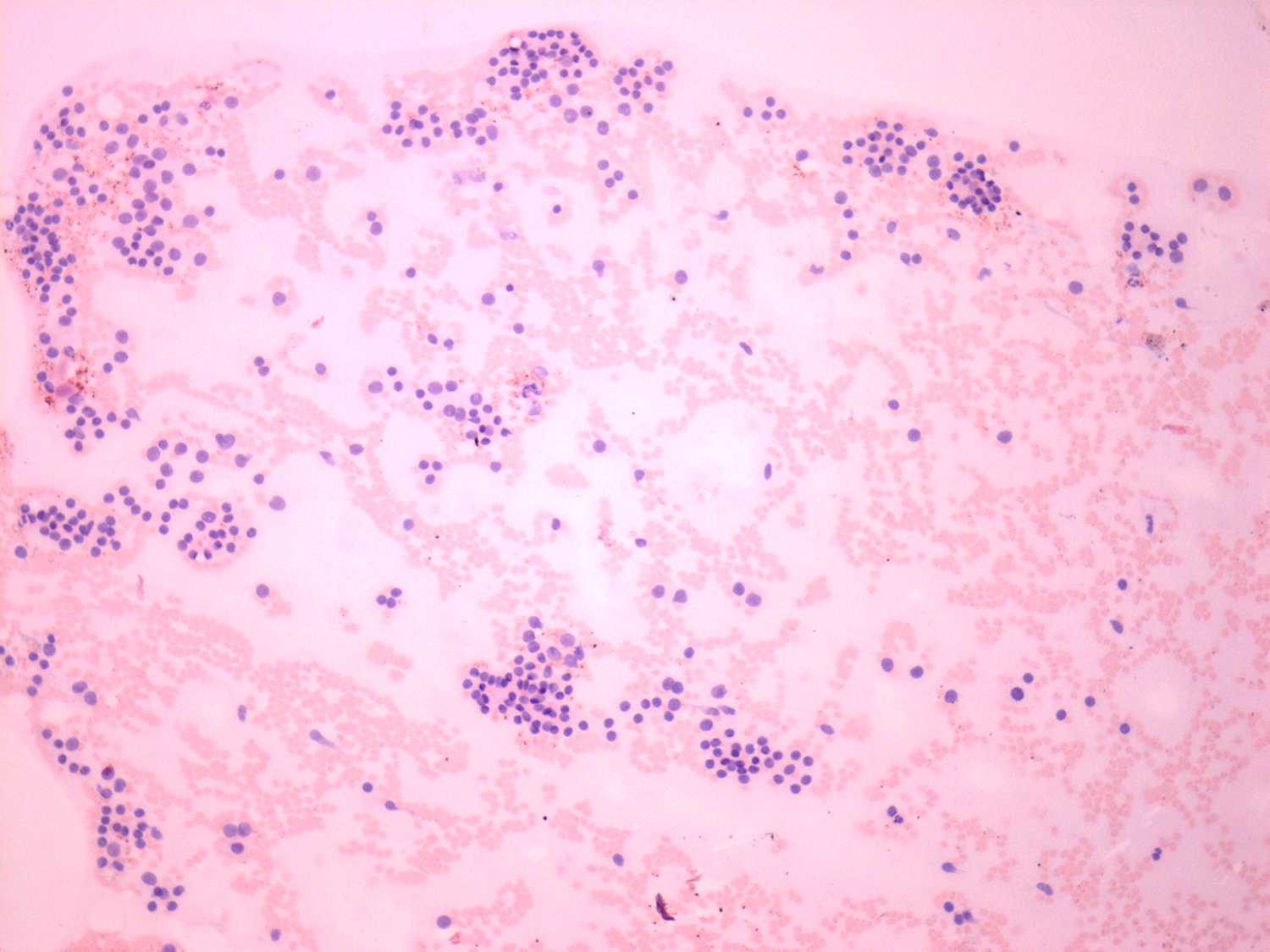 Pap-smear, 100x. There is no colloid in the background. Microfollicles predominate the smear.