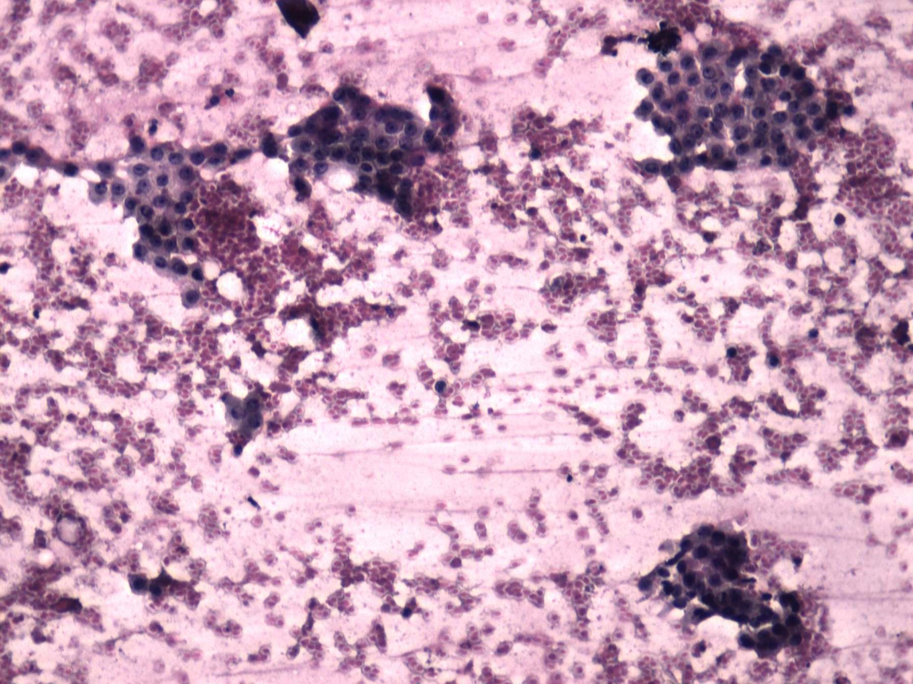 Pap-smear, 100x. Compact clusters of thyrocytes with abundant cytoplasm.