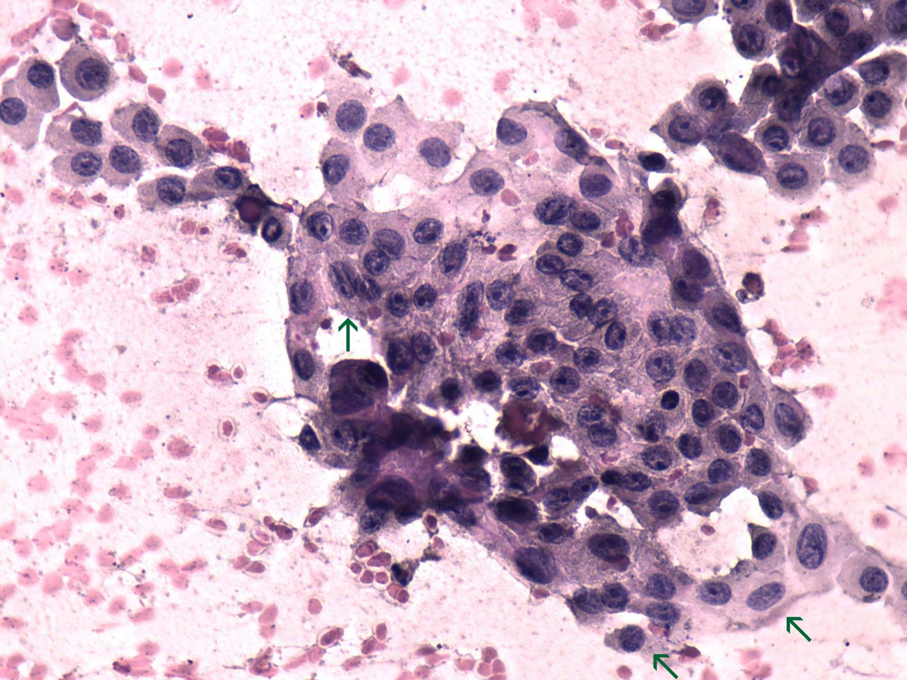 Pap-smear, 400x. Thyrocytes exhibit prominent nucleoli. Intranuclear groove-like figures are present in several follicular cells (arrows). These are probably artifacts, because it is extremely rare in papillary cancer, that thyrocytes exhibit grooves with such high frequency. Even more important is the fact, that in the event of a papillary cancer grooves or inclusions are not the only signs of carcinoma. It is hard to imagine a papillary cancer without anisonucleosis. In this case the cells were practically of even size.