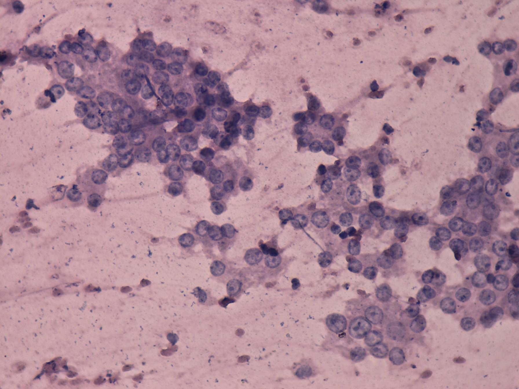 Pap-smear, 400x. Atypical polygonal cells resembling those found in medullary cancer predominate the smear. No nuclear atypia can be observed.