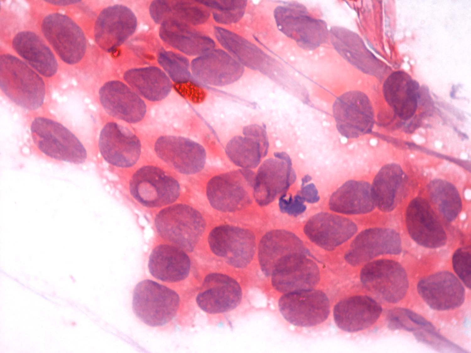 Pap-smear, 1000x. Atypical cell group with nuclear crowding. Follicular cells are elongated, and one of them contains an inclusion. Note nuclear debris.