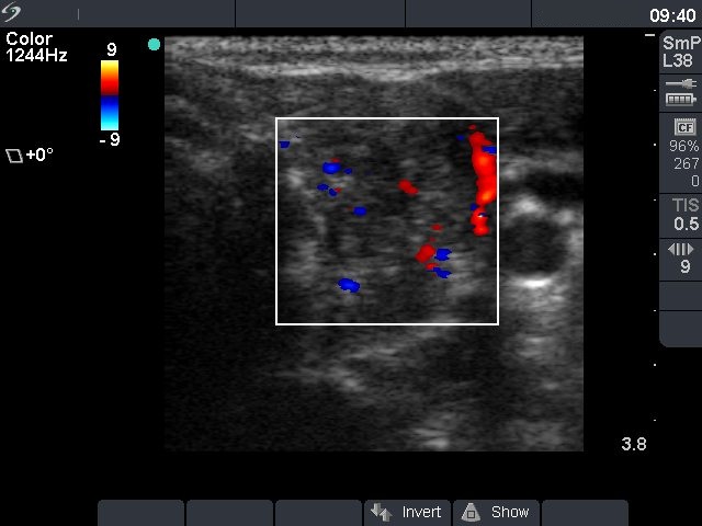 Comment: it is worth comparing the insignificant discrete lesions detected in the right thyroid and the nodule in the left lobe on the video. Note the difference in echogenicity and vascularization.