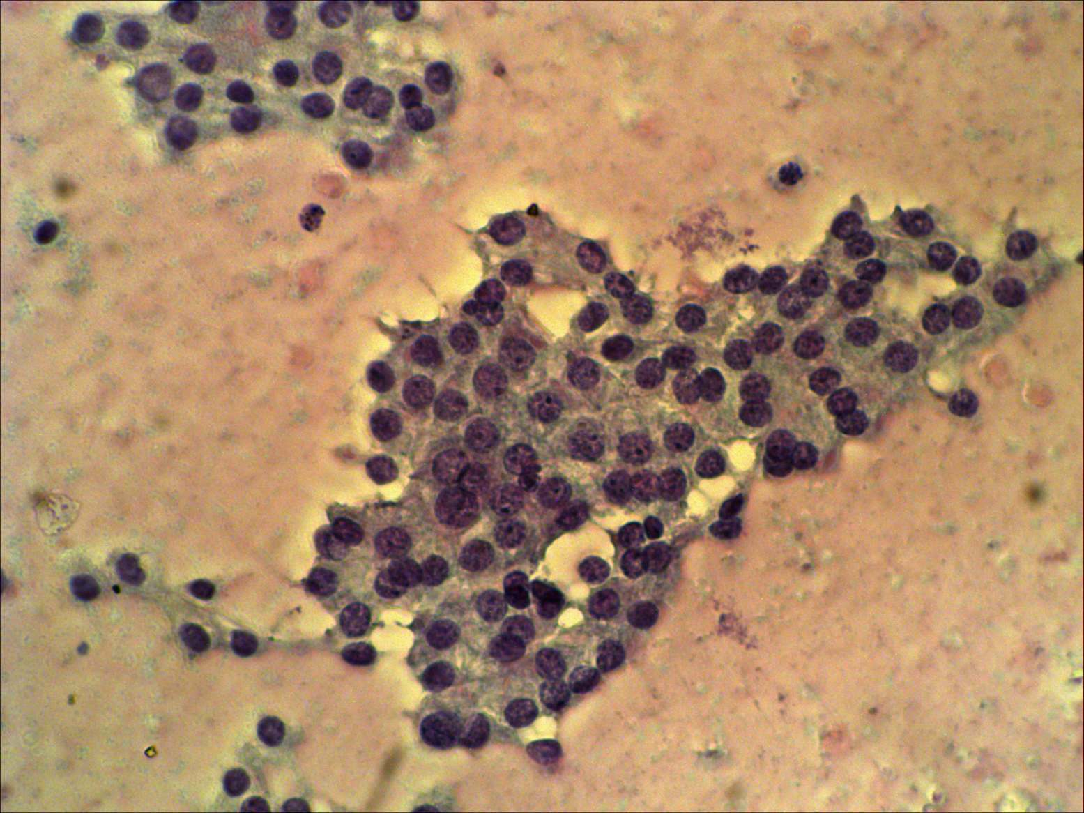 Pap-smear, 400x. Thyrocytes exhibit small, prominent nucleoli, but there is no significant atypia on the smear.
