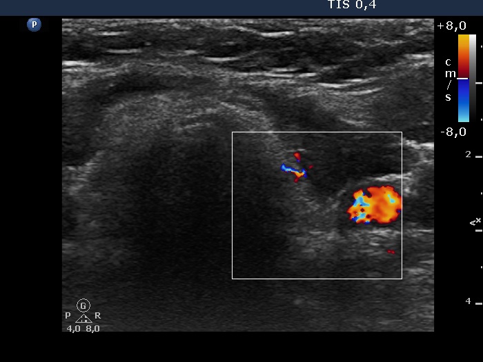 Left lobe, horizontal scan, color Doppler mode. The vascularization is decreased, non-specific.