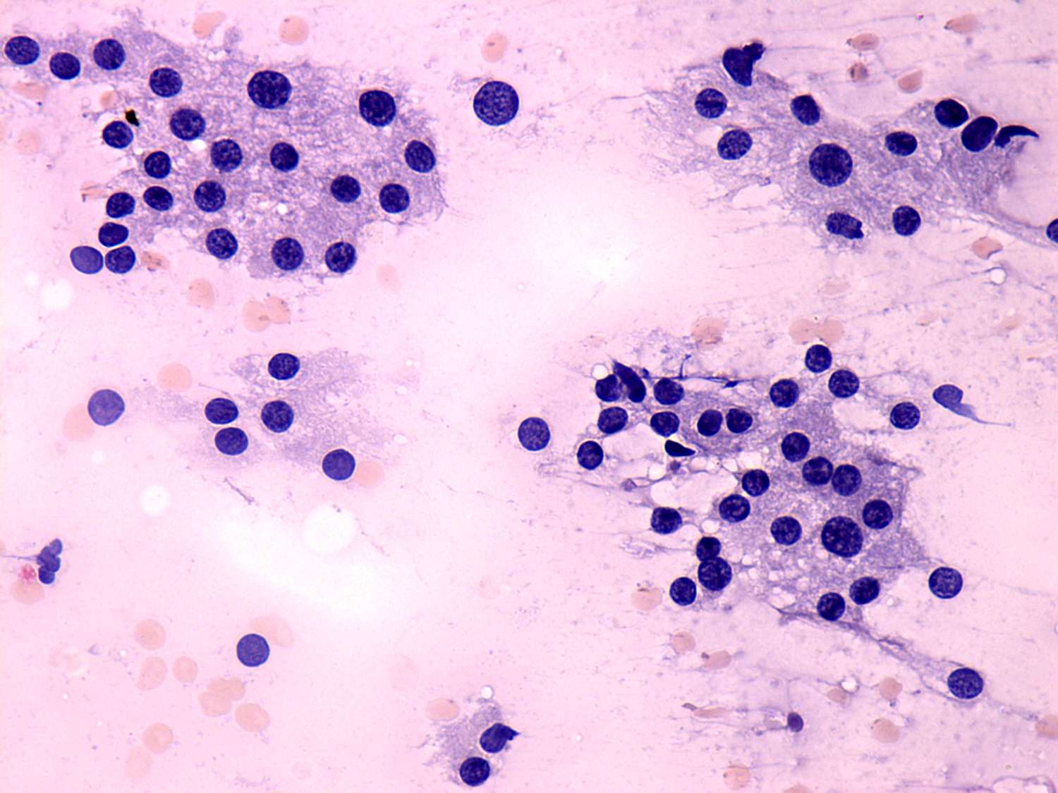 Pap-smear, 400x. Cytoplasmic vacuolization is present. Follicular cells display anisonucleosis.