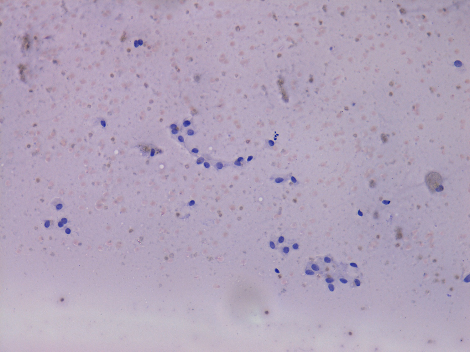 Pap-smear, 200x. A normofollicle can be seen in the lower part of the image.