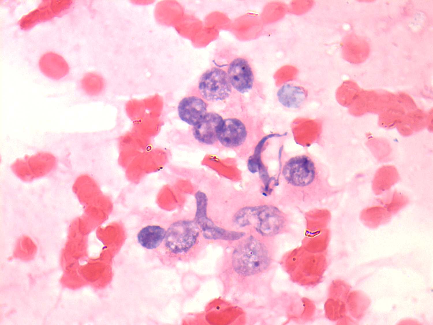 Pap-smear, 1000x. Histiocytes, epitheloid cells and one microfollicle composed of degenerated follicular cells.