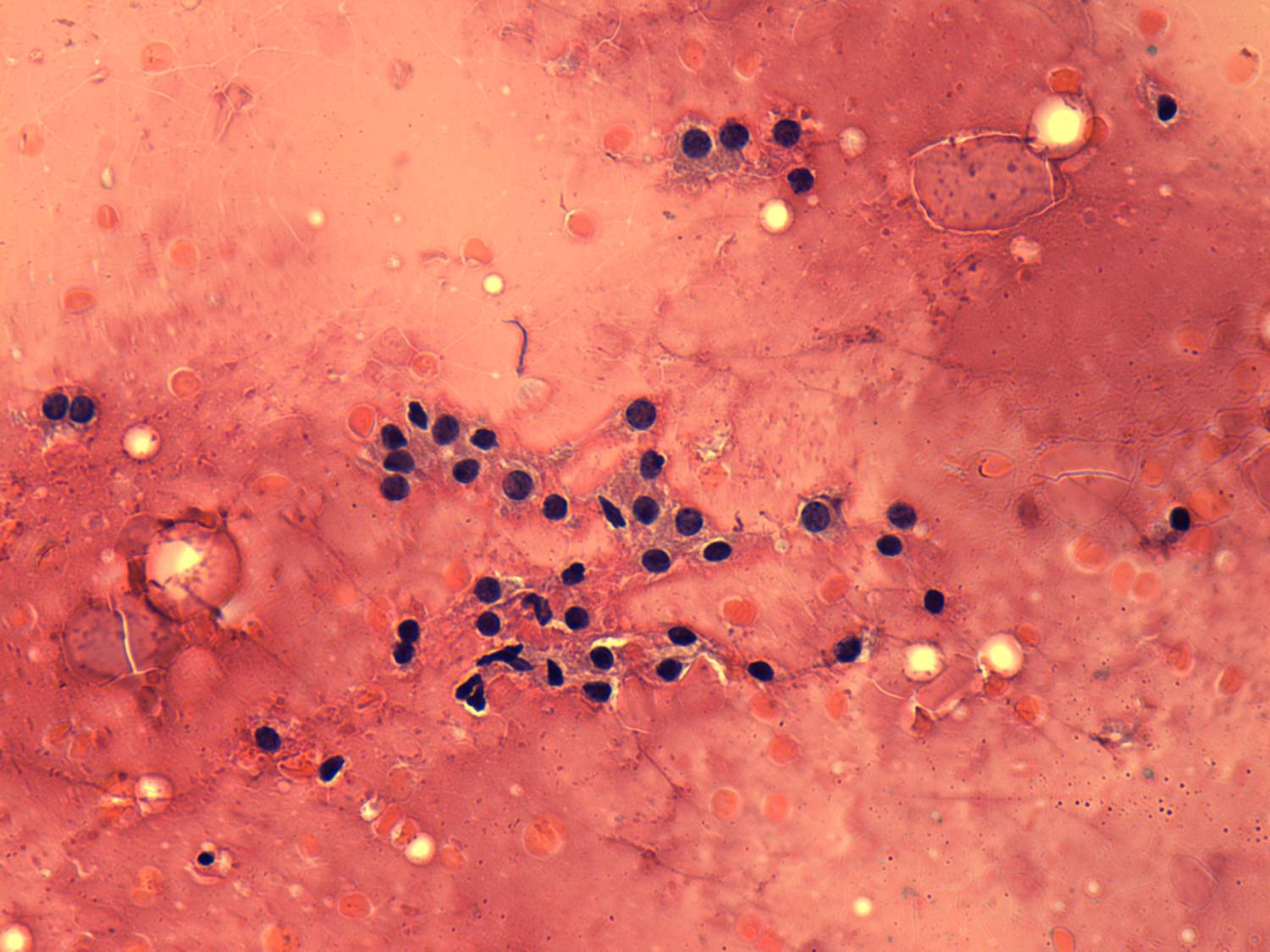 Pap-smear, 400x. Microfollicles and dissociated thyrocytes.