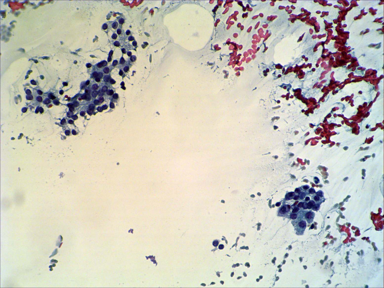 Pap-smear, 200x. Loose clusters of follicular cells with vacuolization.