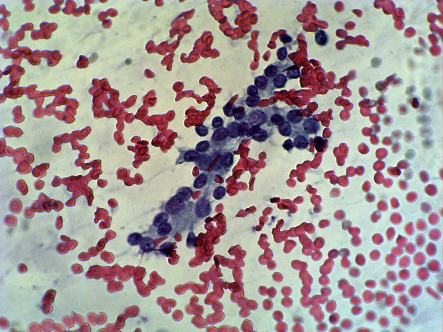 Pap-smear, 400x. Microfollicles predominate this cluster. A few enlarged elongated cells can be seen as signs of hormonal influence.