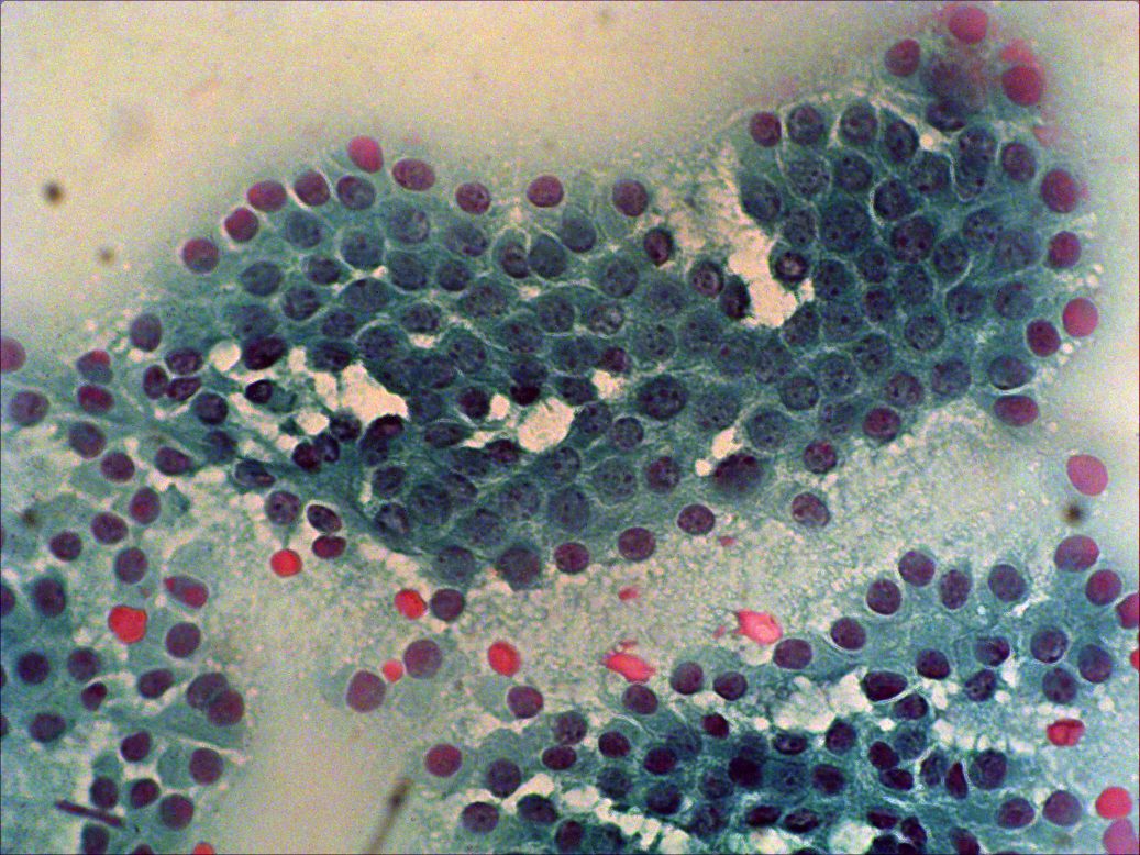 Pap-smear, 400x. A monolayered sheet formed by oxyphilic cells.