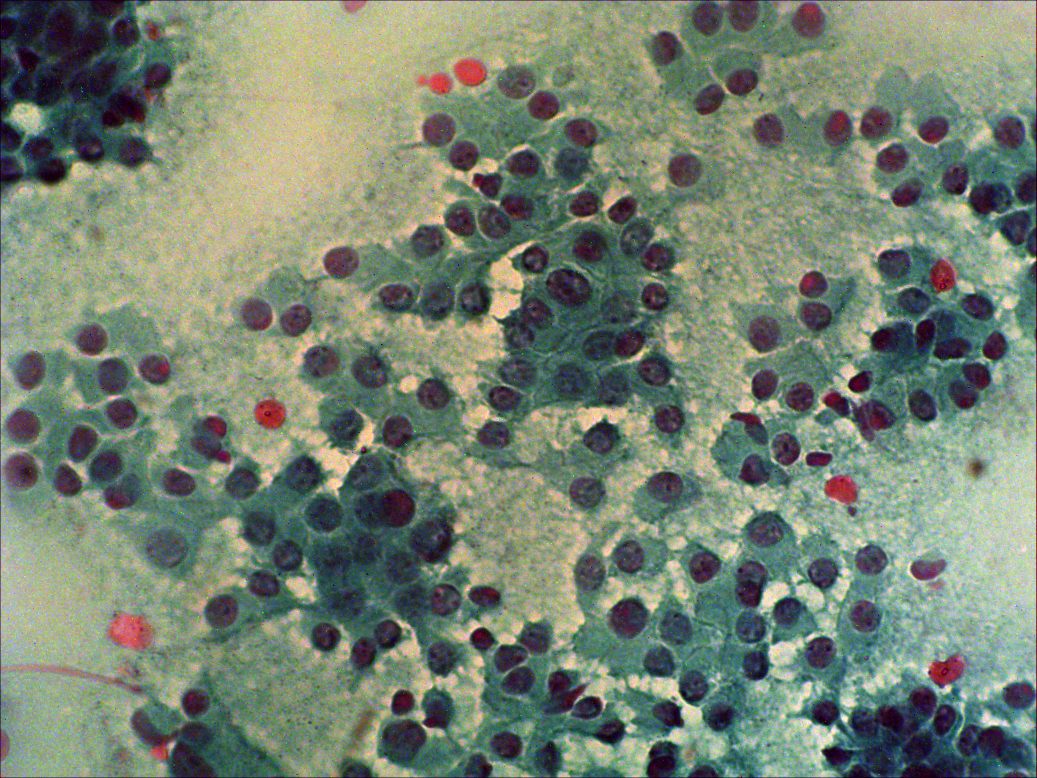 Pap-smear, 400x. Microfollicles formed by Hürthle-cells of even size. No significant atypia is present. Note prominent nucleoli.