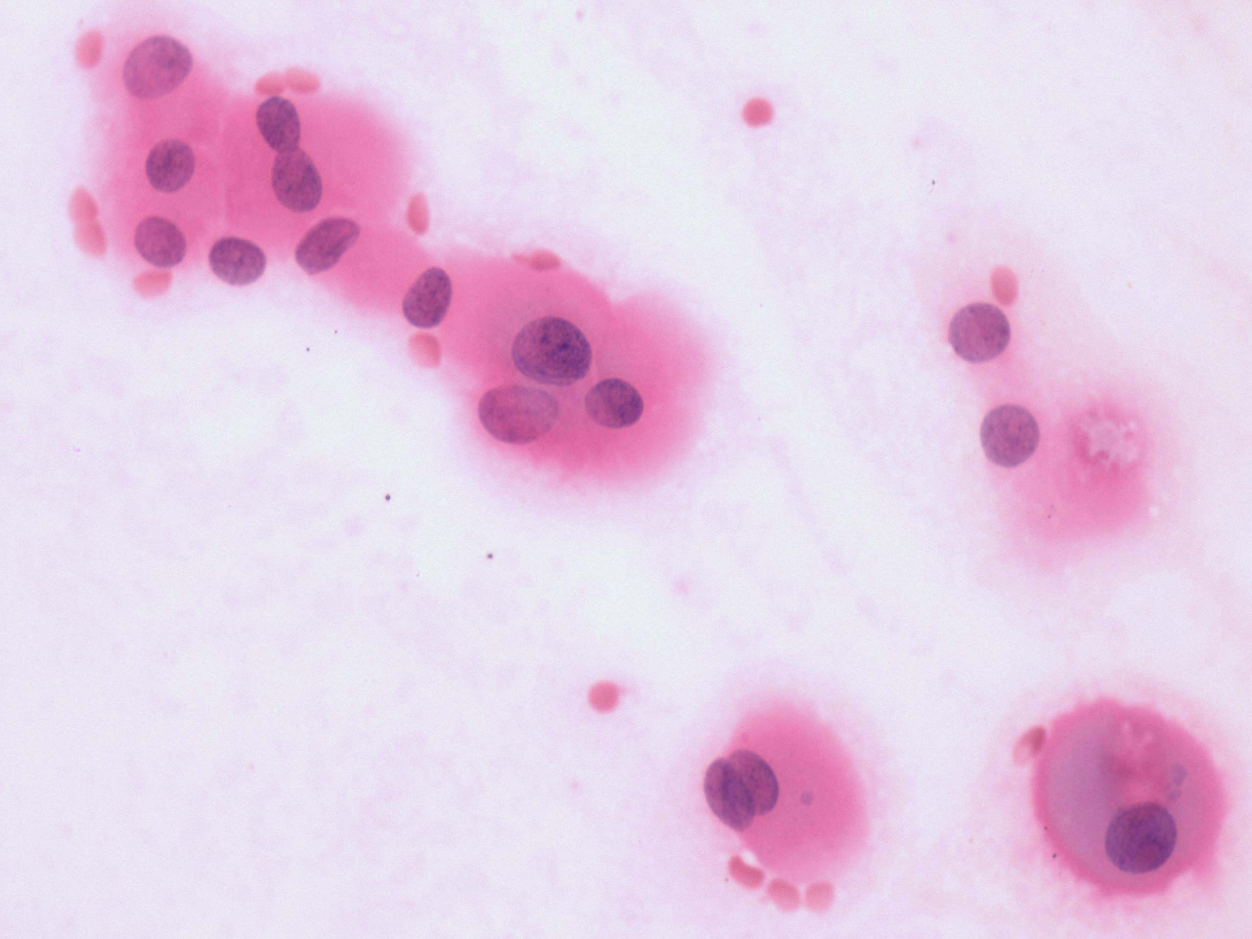 H.-E. smear, 400x. Oxyphilic cells with sharp cytoplasmic borders.