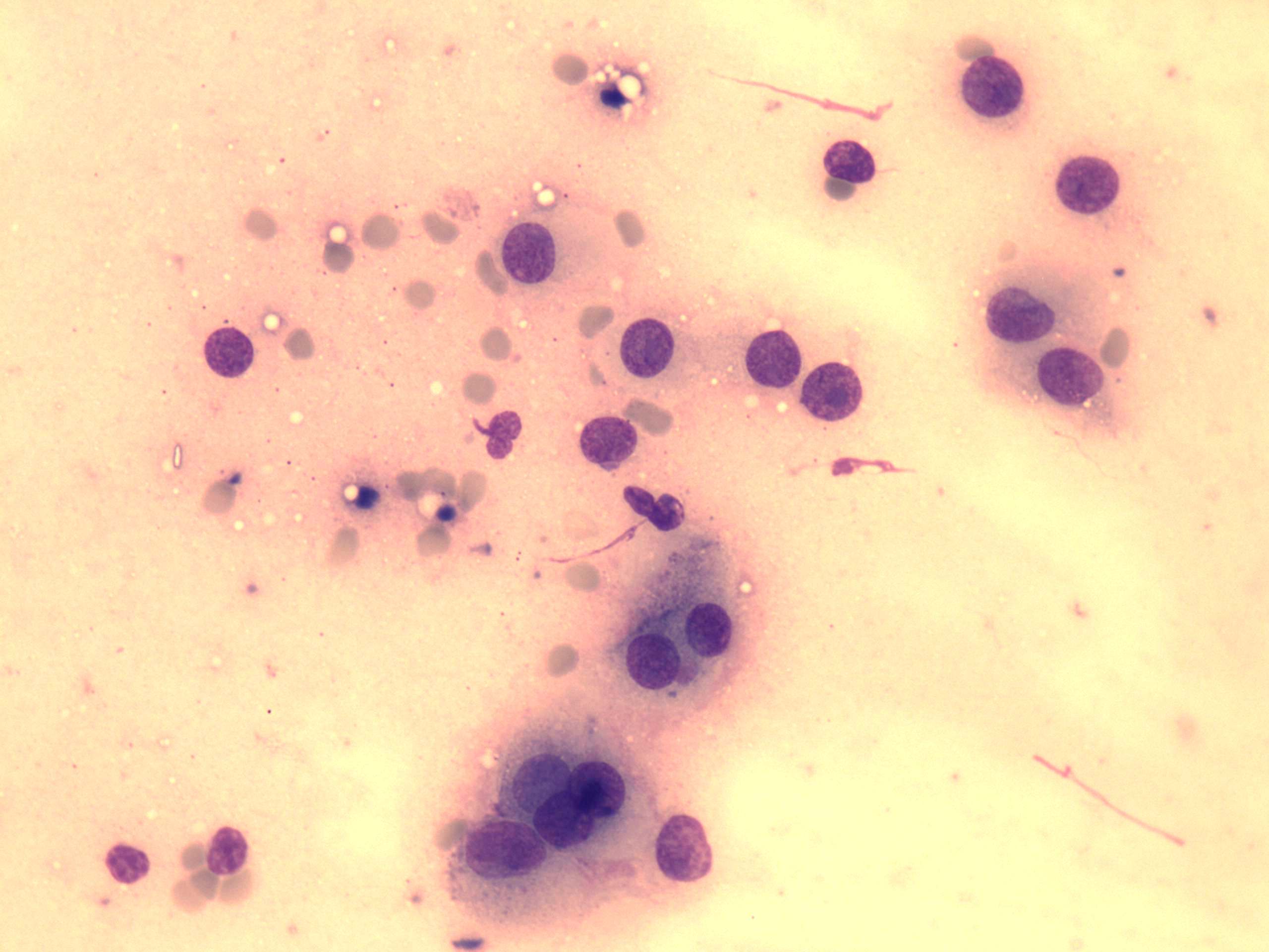 Wright-Giemsa staining, 400x. Several nuclei contain prominent nucleoli.