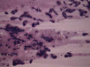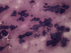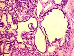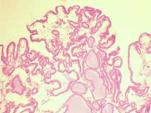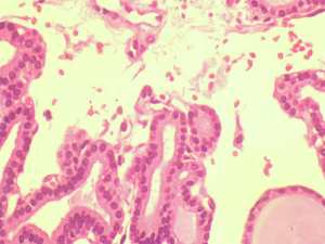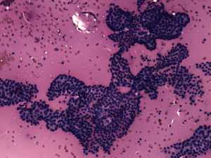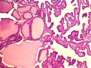This is a clear misinterpretation of the cytological pattern. The failure is explained first of all by the lack of enough cytological experience at the time of diagnosis. (We examined this patient in 1994 and this was our 1,307th thyroid FNAC. Now, in 2016 we are over 43,000 thyroid FNAC-s.) Moreover, this was a turning point in our cytological practice. We never again stained our smears with hematoxylin-eosin after the result of histopathology because of the weakness of this staining method to recognize nuclear inclusions and grooves.