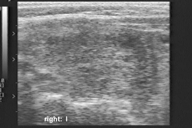 Ultrasonography: a moderately hypoechogenic nodule with lobulated margins occupied almost the entire right thyroid.