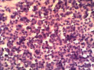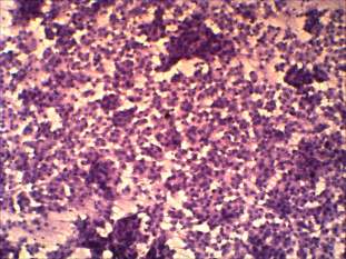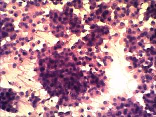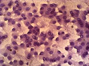Cytological picture: no colloid in the background. Extremely cellular picture. Thyrocytes in irregular clusters, in microfollicles and predominantly dissociated. Almost all cells exhibit oxyphilic metaplasia and prominent nucleoli. Many cells contain groove. The size of the cells is relatively uniform.