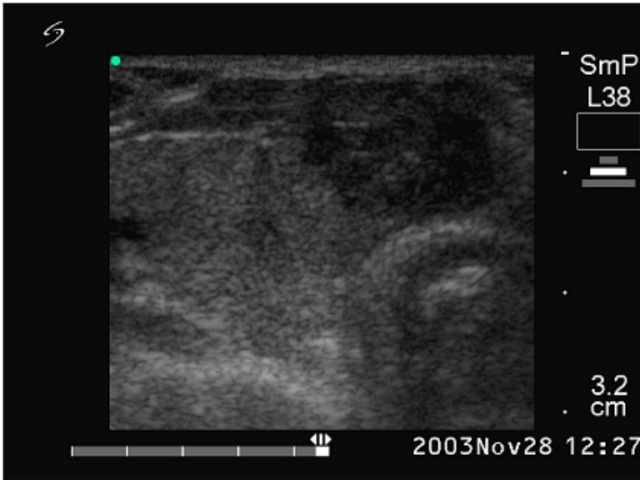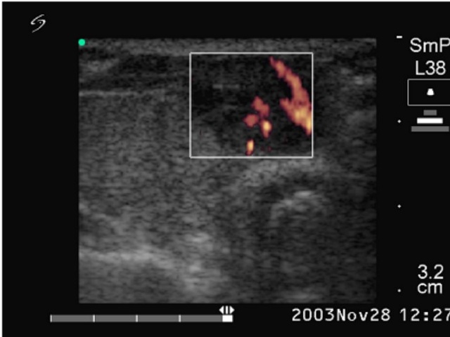 Ultrasonography: echonormal thyroids with two nodules close to each other in the isthmus. They were hypoechogenic inhomogeneous and exhibited irregularly increased intranodular blood flow.