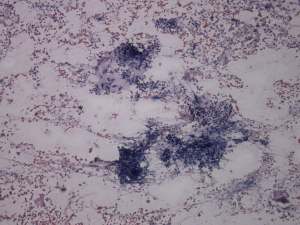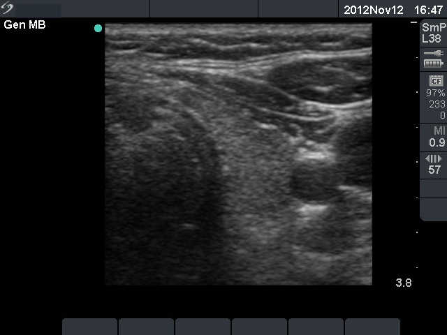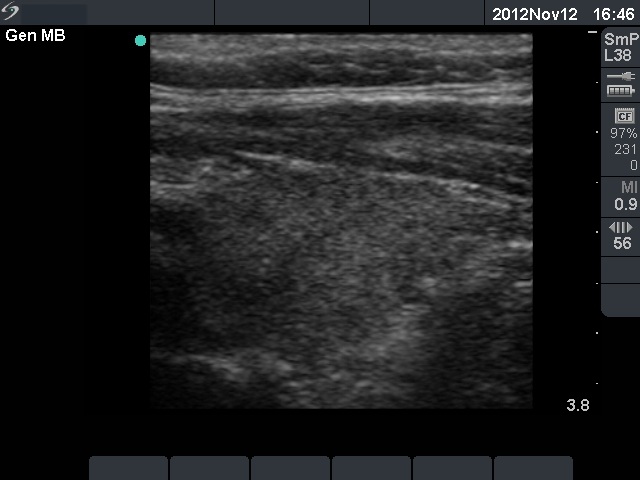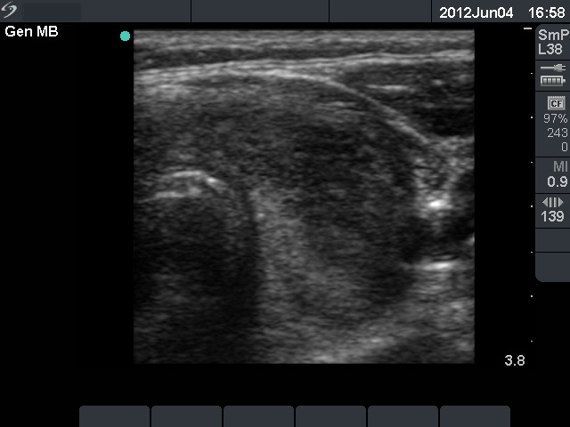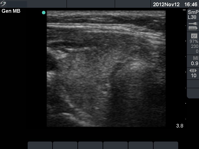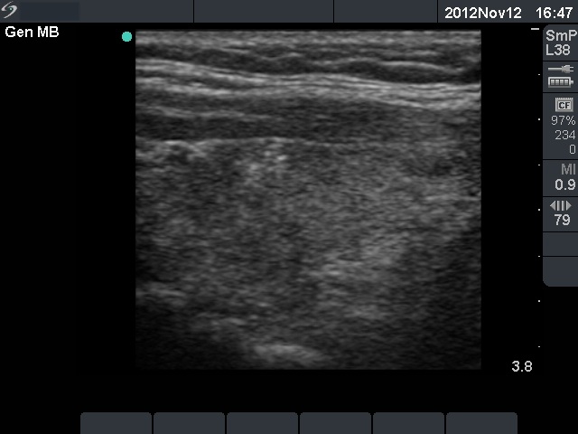 Ultrasonography: there were multiple hypoechogenic areas with blurred borders within echonormal background. The vascularization was decreased.