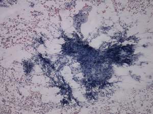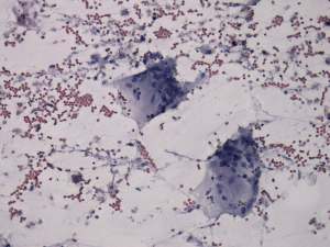 Cytological diagnosis: subacute, granulomatous de Quervain's thyroiditis.